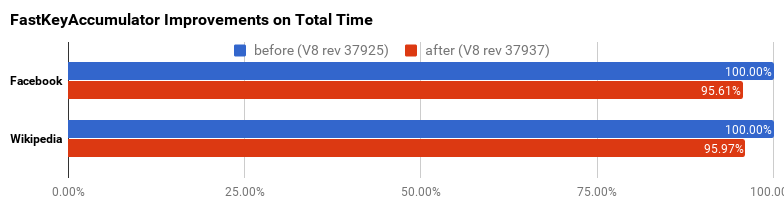 Wikipedia and Facebook both improved their total script time by 4% due to various for-in improvements. Note that during the same period, the rest of V8 also got faster, which yielded a total scripting improvement of more than 4%.