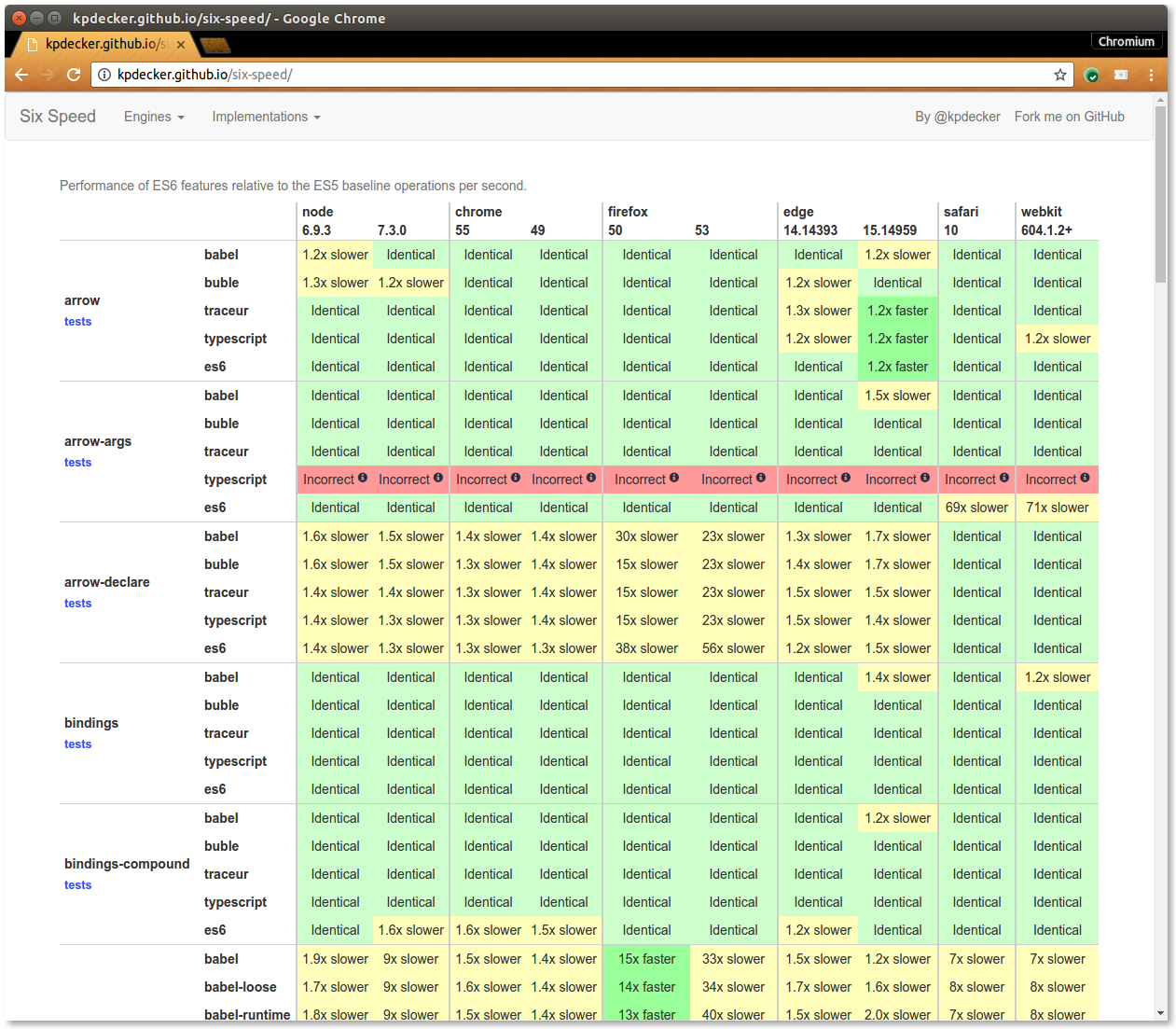 As described above, absolute performance of ES2015+ features is not really an issue at this point. Instead the highest priority currently is to ensure that performance of ES2015+ features is on par with their naive ES5 and even more importantly, with the version generated by Babel. Conveniently there was already a project called SixSpeed by Kevin Decker, that accomplishes more or less exactly what we needed: a performance comparison of ES2015 features vs. naive ES5 vs. code generated by transpilers.