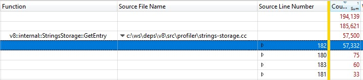 Because this was run with a release build, the information of the inlined function calls were folded into StringsStorage::GetEntry(). To figure out exactly how much time the inlined function calls were taking, I added the “Source Line Number” column to the breakdown and found that most of the time was spent on line 182, which was a call to ComputeStringHash():