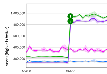 For spreading strings ([...string]), we measured a roughly 5× improvement, as shown in the graph below by the purple and green lines. Note that this is even faster than a TurboFan-optimized for-of-loop (TurboFan understands string iteration and can generate optimized code for it), represented by the blue and pink lines. The reason for having two plots in each case is that the micro-benchmarks operate on two different string representations (one-byte strings and two-byte strings).