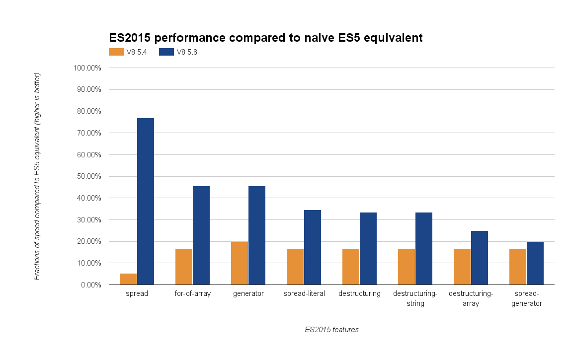 V8’s goal is to reduce the performance gap between transpilers and V8’s “native” ES.next performance in order to eliminate the latter challenge. We’ve made great progress in bringing the performance of new language features on-par with their transpiled ES5 equivalents. In this release you will find the performance of ES2015 features is significantly faster than in previous V8 releases, and in some cases ES2015 feature performance is approaching that of transpiled ES5 equivalents.
