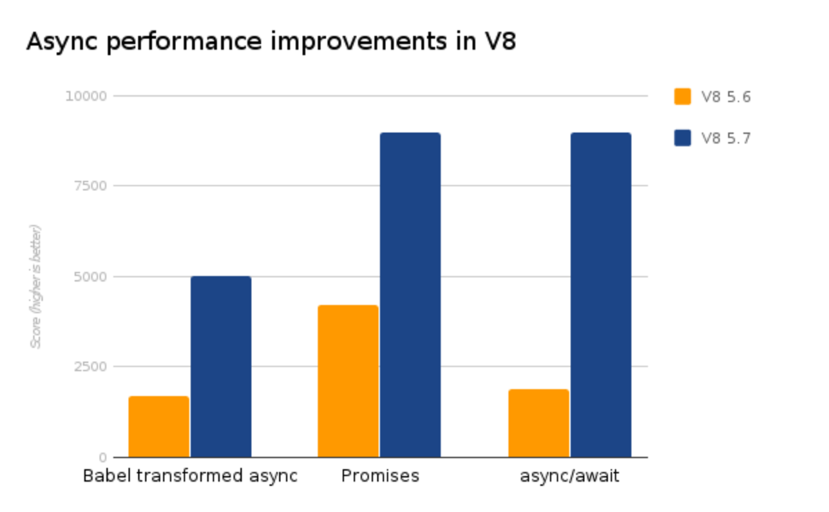 Async functions are now approximately as fast as the same code written with promises. The execution performance of async functions quadrupled according to our microbenchmarks. During the same period, overall promise performance also doubled.