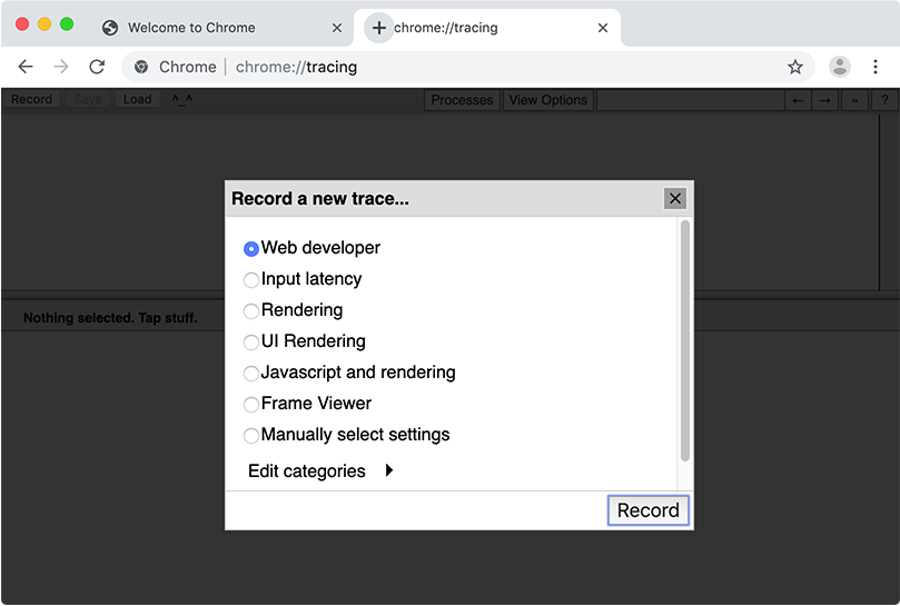 Click on the “Record” button to prepare recording a trace. First choose “Web developer” and then select “Edit categories”.