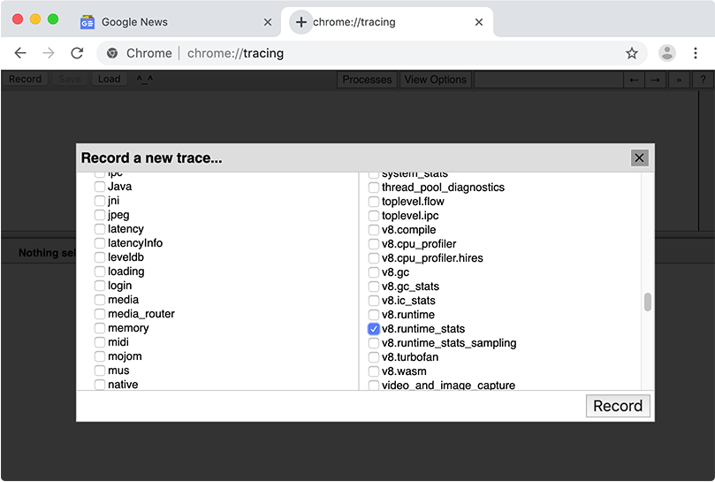 Select v8.runtime_stats from the list. Depending on how detailed your investigation is, you may select other categories as well.