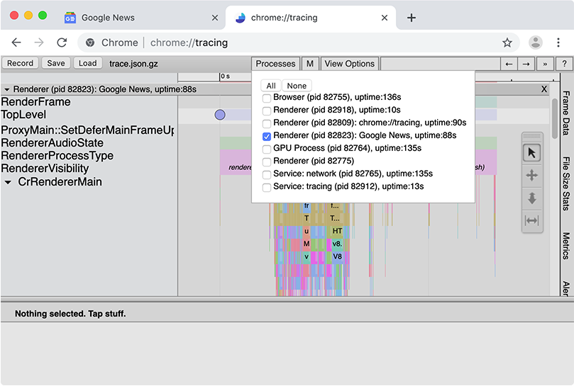 Look for a “Renderer” section that contains the web page title from the recorded tab. The easiest way to do this is by clicking “Processes”, then clicking “None” to uncheck all entries, and then selecting only the renderer you’re interested in.